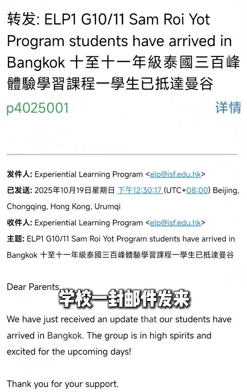 终于在10月28日,杨威在社交媒体上曝光了儿子失联了,杨阳洋所在的香港学校组织了一场特殊的研学活动,整个年级搬迁至泰国300峰国家公园进行沉浸式学习,为了保证体验效果,学校统一没收了所有学生的手机,学校就给家长们发了一封邮件。